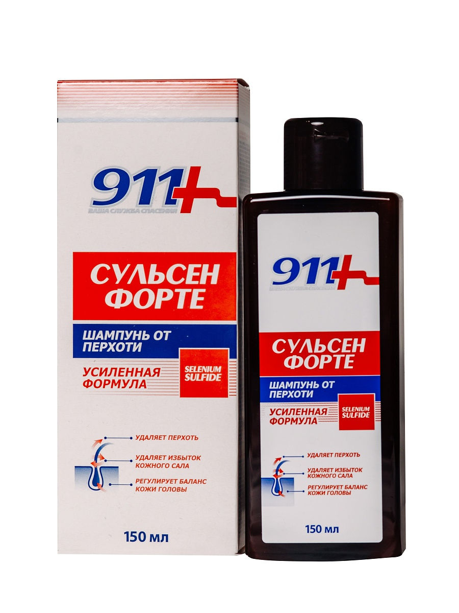 - Шампунь «Сульсен Форте» для всех типов волос товарного знака «911 Ваша служба спасения» оказывает отшелушивающее действие. Содержит Сульсен (Дисульфид Селена) - активный компонент, устраняющий перхоть. Мягкая моющая формула шампуня не раздражает кожу и очищает волосы, не повреждая их защитного слоя. Для достижения результата достаточно использовать средство 2 раза в неделю в течение 3-4 недель, затем для профилактики появления перхоти - 2 раза в месяц. Средство косметическое.