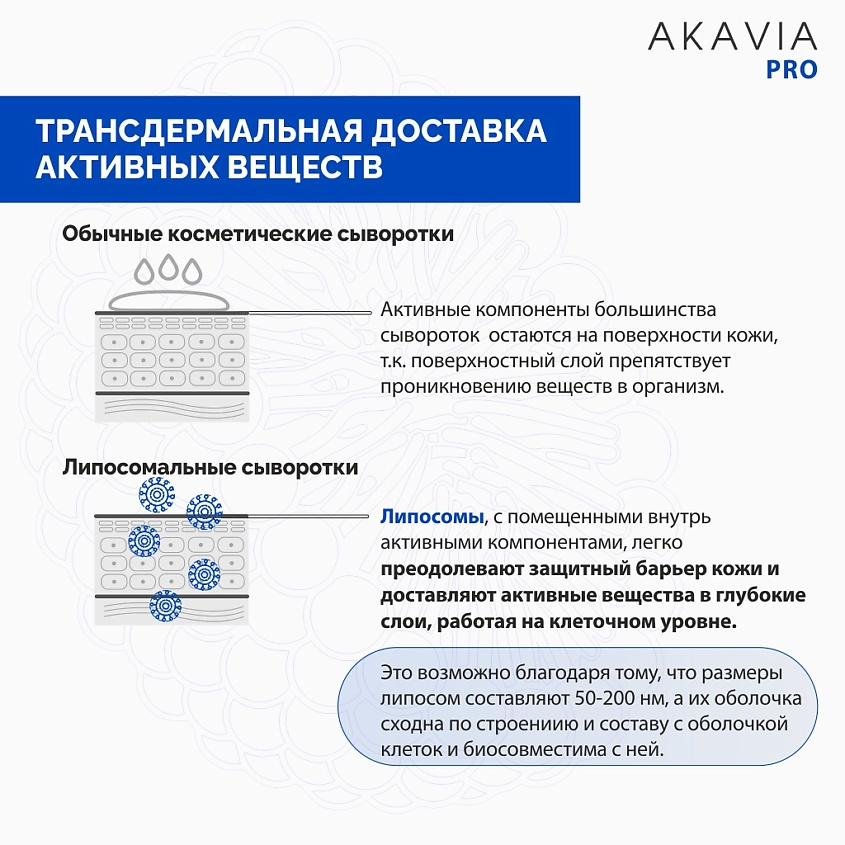 Липосомы способны проходить через эпидермальный барьер и доставлять активные вещества в полном объеме в глубокие слои кожи.