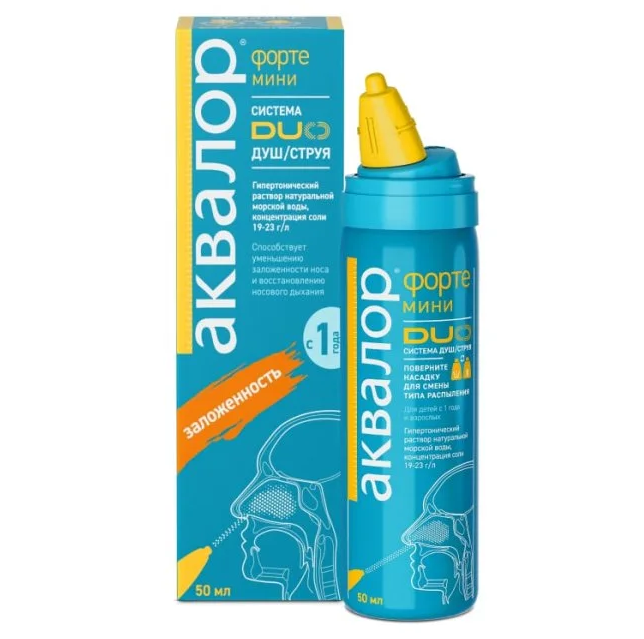 Средство для орошения и промывания полости носа для детей и взрослых в вариантах исполнения «Аквалор® форте мини» 50 мл, «Аквалор® форте» 150 мл по ТУ 32.50.50-010-00480081-2017.