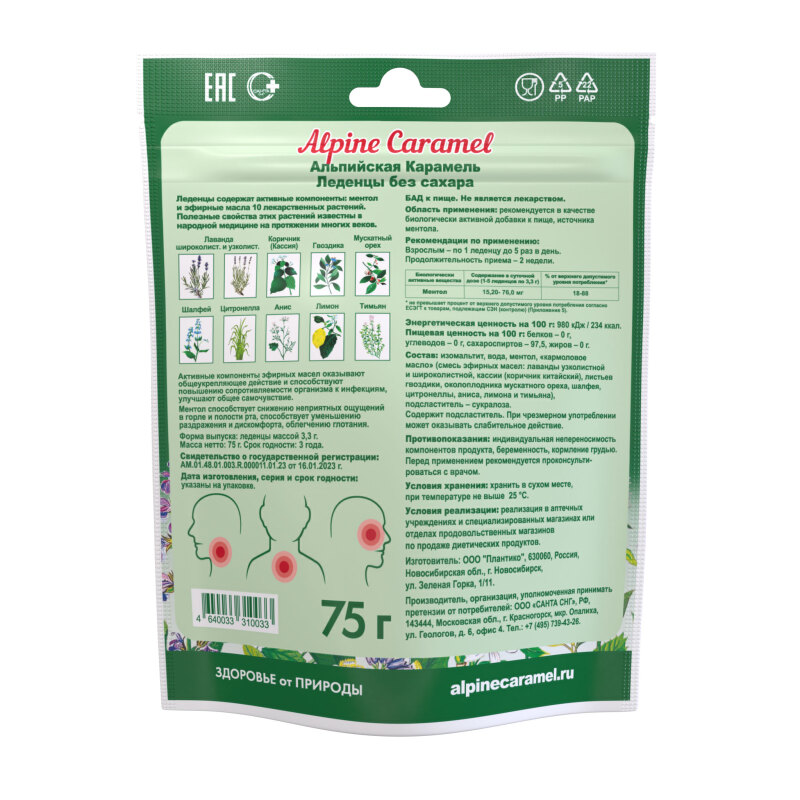 Леденцы Alpine Caramel Альпийская Карамель содержат кармоловое масло (уникальный комплекс эфирных масел 10 лекарственных растений) и ментол. Полезные свойства этих лекарственных растений известны на протяжении многих веков. Состав проверен временем и подбирался с учетом синергии компонентов, когда в комплексе они дополняют и усиливают действие друг друга. Активные компоненты кармолового масла способствуют повышению сопротивляемости организма к инфекциям, улучшают общее самочувствие. Комплекс эфирных масел обладает антисептическим, противомикробным, противовирусным, иммуностимулирующим и мягким гармонизирующим действием на нервную систему. Компоненты эфирных масел лекарственных растений улучшают отхождение мокроты, стимулируют пищеварение, улучшают общее состояние организма.