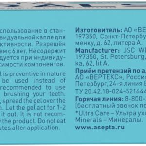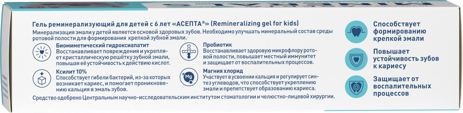 Детский гель реминерализующий создан для формирования и укрепления зубной эмали у детей с 6 лет. Минерализация, или «созревание» эмали у детей при смене молочных зубов на коренные является основой здоровых зубов во взрослом возрасте. После активной фазы минерализации насыщение эмали микроэлементами и минералами замедляется. Реминерализующий гель АСЕПТА для детей создает необходимые условия для формирования крепкой зубной эмали за счет улучшения минерального состава микрофлоры полости рта. Вкус "клубника-йогурт.