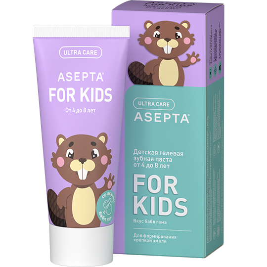 - Вкусная зубная паста ASEPTA Kids с популярным у детей вкусом «Бабл гам» поможет сформировать у ребенка полезную привычку заботиться о гигиене полости рта каждый день.