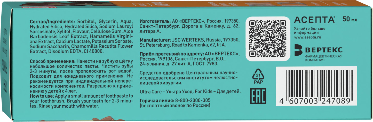 Асепта Kids Вкус Тутти-фрутти детская гелевая зубная паста от 4 до 8 лет туба 50мл