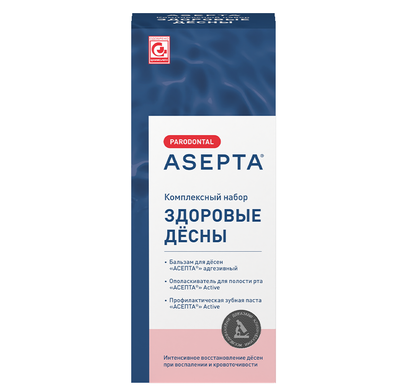 Набор «Асепта Здоровые десны» представляет собой комплекс из трех средств серии «Асепта», которые обеспечивают максимально активное снятие воспаления пародонта: