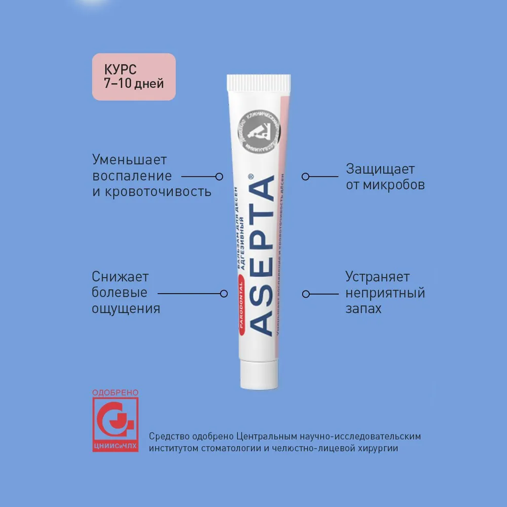 - АСЕПТА® бальзам для дёсен для локального воздействия на очаг воспаления.