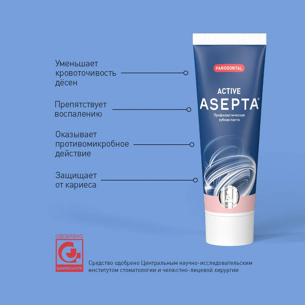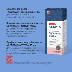- АСЕПТА® ACTIVE профилактическая зубная паста для бережной гигиены полости рта при воспалительных процессах слизистой оболочки полости рта.