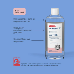- АСЕПТА® ACTIVE ополаскиватель для полости рта для уменьшения кровоточивости и снижения болевых ощущений при повышенной чувствительности дёсен.