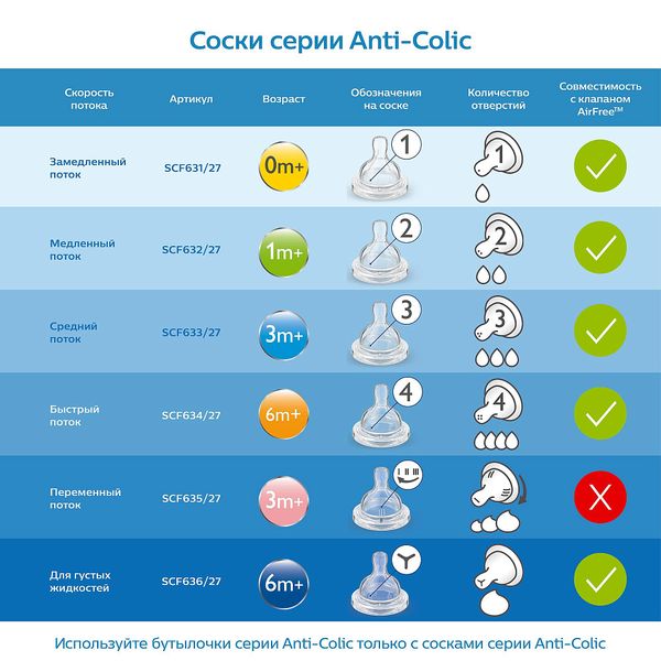 Доступны соски разной скорости потока для кормления вашего растущего малыша. Соски Philips Avent серии Anti-Colic имеют разную скорость потока — предпочтительная скорость зависит от возраста и индивидуальных особенностей малыша. Мы рекомендуем менять соску каждые 3 месяца в гигиенических целях. Используйте бутылочки Philips Avent серии Anti-Colic только вместе с сосками Philips Avent серии Anti-Colic. Бутылочки Philips Avent серии Anti-Colic совместимы с клапаном AirFree. Бутылочку можно использовать с ним и без него, в зависимости от ваших потребностей.