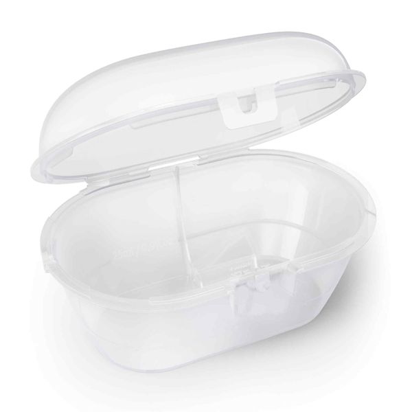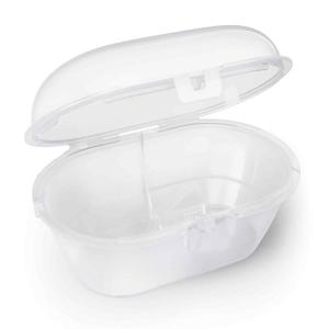 Положите в футляр хорошо промытые пустышки, добавьте 25 мл воды и поставьте его в микроволновую печь на 3 минуты при мощности 750-1000 Вт. Охладите в течение 5 минут, вылейте из футляра воду - и процесс завершен!
