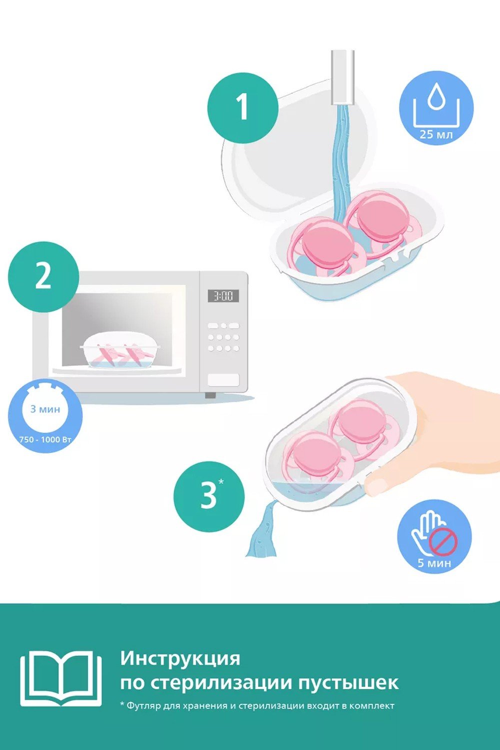 Несколько простых шагов для стерилизации за 3 минуты. С помощью стерилизатора/ контейнера для переноски можно выполнить стерилизацию соски-пустышки в микроволновой печи и взять ее с собой в дорогу.