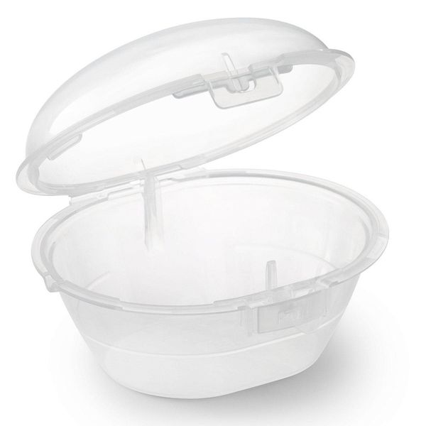 Положите в футляр хорошо промытые пустышки, добавьте 25 мл воды и поставьте его в микроволновую печь на 3 минуты при мощности 750-1000 Вт. Охладите в течение 5 минут, вылейте из футляра воду - и процесс завершен!