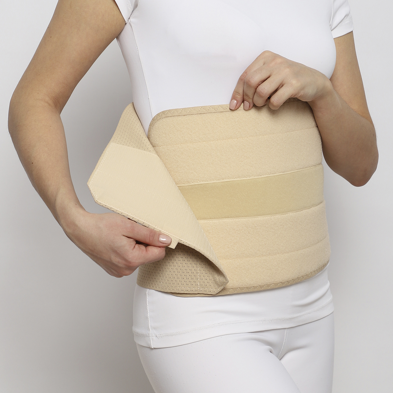 - Мягкая панель ложится на послеоперационный шов и фиксируется на застежку-липучку Velcro.