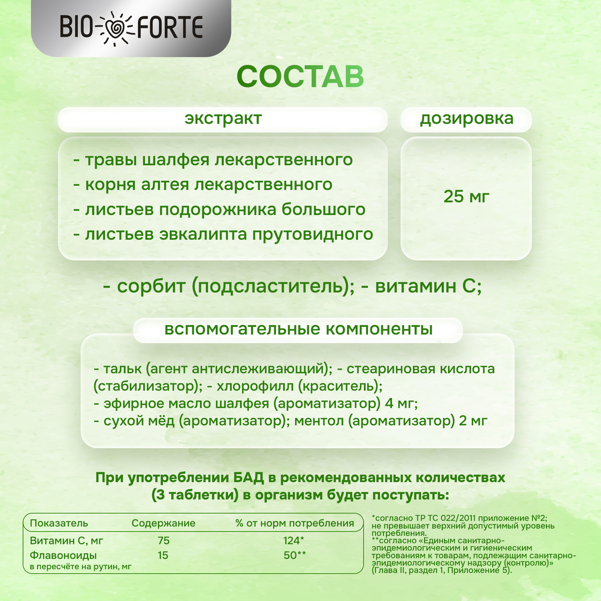 Сорбит (Е 420), витамин С (L-Аскорбиновая кислота), экстракт травы шалфея лекарственного, экстракт травы алтея лекарственного, экстракт листьев подорожника большого, экстракт листьев эвкалипта прутовидного, тальк (Е 553iii), стеариновая кислота (Е 570), хлорофилл (Е140), эфирное масло шалфея (ароматизатор), концентрат мёда сухого, ментол.