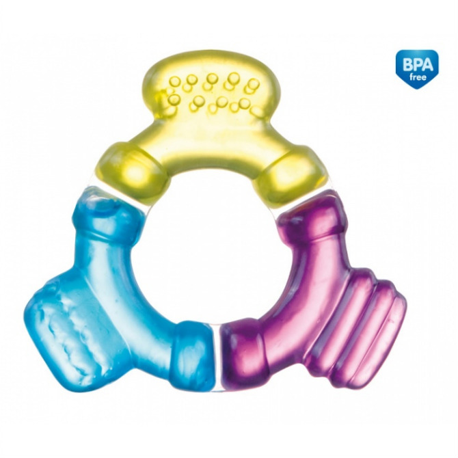 Поверхность прорезывателя мягкая и приятная на ощупь, в то же время устойчива к укусам малыша. Внутри находится дистилированная вода.