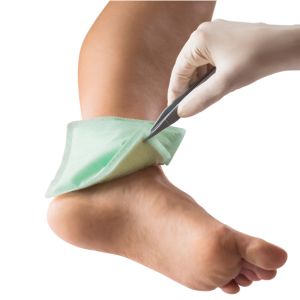 - Снимите защитные листы. Наложите повязку адгезивной стороной на рану так, чтобы зеленая сторона была обращена в сторону от раны.