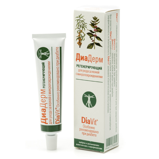Крем ДиаДерм Регенерирующий ускоряет восстановление кожи в местах её микроповреждений: инъекции инсулина, прокол кожи на кончиках пальцев для забора крови на анализ, трещинки, ссадинки, царапины. Специальная основа крема «запечатывает» ранку, препятствуя проникновению инфекции, активные компоненты способствуют остановке капиллярного кровотечения и регенерации кожи.