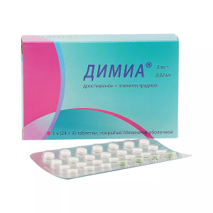 Препарат Димиа® является комбинированным монофазным пероральным контрацептивным средством (КОК), содержащим дроспиренон и этинилэстрадиол. По своему фармакологическому профилю дроспиренон близок к натуральному прогестерону: не обладает эстрогенной, глюкокортикоидной и антиглюкокортикоидной активностью и характеризуется выраженным антиандрогенным и умеренным антиминералокортикоидным действием. Контрацептивный эффект основывается на взаимодействии различных факторов, важнейшими из которых являются торможение овуляции, увеличение вязкости секрета шейки матки и изменение эндометрия. Индекс Перля, показатель, отражающий частоту наступления беременности у 100 женщин репродуктивного возраста в течение года применения контрацептива, составляет менее 1.