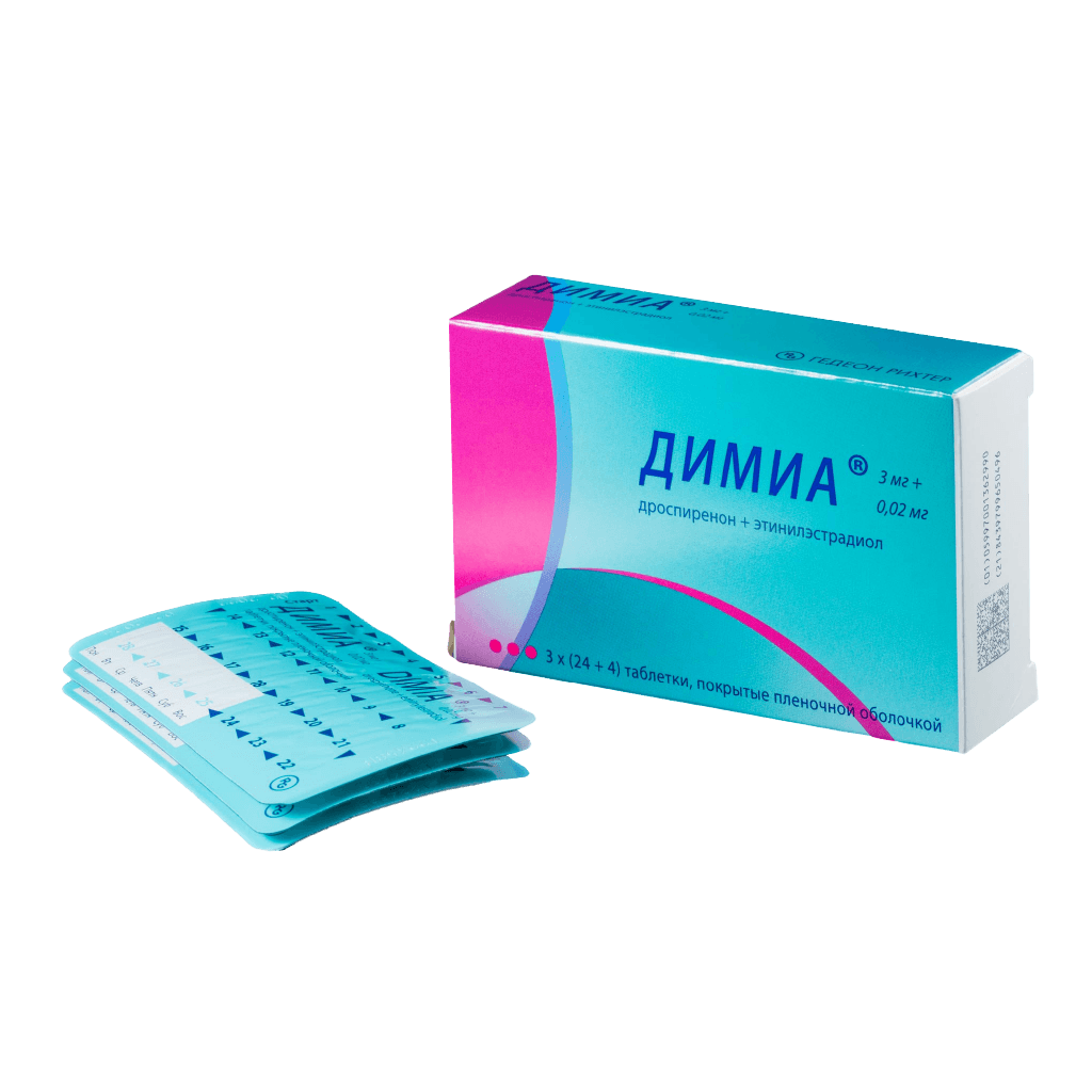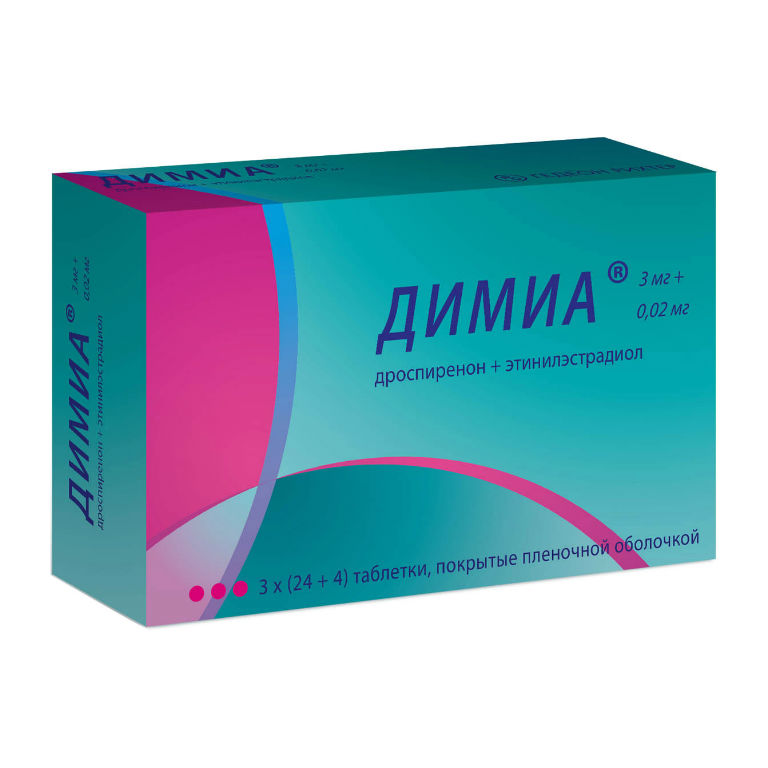 Препарат Димиа® является комбинированным монофазным пероральным контрацептивным средством (КОК), содержащим дроспиренон и этинилэстрадиол. По своему фармакологическому профилю дроспиренон близок к натуральному прогестерону: не обладает эстрогенной, глюкокортикоидной и антиглюкокортикоидной активностью и характеризуется выраженным антиандрогенным и умеренным антиминералокортикоидным действием. Контрацептивный эффект основывается на взаимодействии различных факторов, важнейшими из которых являются торможение овуляции, увеличение вязкости секрета шейки матки и изменение эндометрия. Индекс Перля, показатель, отражающий частоту наступления беременности у 100 женщин репродуктивного возраста в течение года применения контрацептива, составляет менее 1.