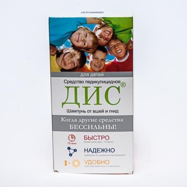 Педикулезное средство Дис эффективно убивает паразитов, не оказывая негативного влияния на человека. За счет отсутствия токсичных компонентов в составе шампунь от вшей не вызывает у насекомых устойчивости, а потому может использоваться сколько раз, сколько это необходимо. Средство контактного действия для лечения головного и лобкового педикулеза у взрослых и детей от 5 лет. Эффективно действует на все виды вшей и гнид, устойчивых к другим педикулицидам, при 15 минутном контакте. Средство педикулицидное ДИС (шампунь, комплект с расческой и шапочкой) - быстро и эффективно уничтожает головные и лобковые вши, их личинки и яйца (гниды).