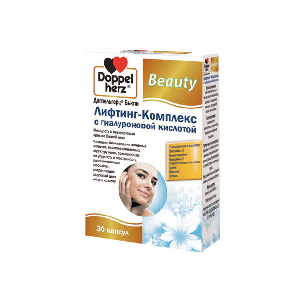 Доппельгерц® Бьюти Лифтинг-Комплекс с гиалуроновой кислотой - молодость и неувядающая красота Вашей кожи. Комплекс сочетает в себе наиболее активные компоненты, витамины и минеральные вещества, способствующие интенсивному лифтингу кожи, восстановлению ее тонуса и упругости. Благодаря гиалуроновой кислоте в составе комплекса, происходит глубокое насыщение кожи влагой, витамин Е способствует сохранению эластичности кожи и разглаживанию морщин, биотин предотвращает сухость кожи и стимулирует ее регенерацию.