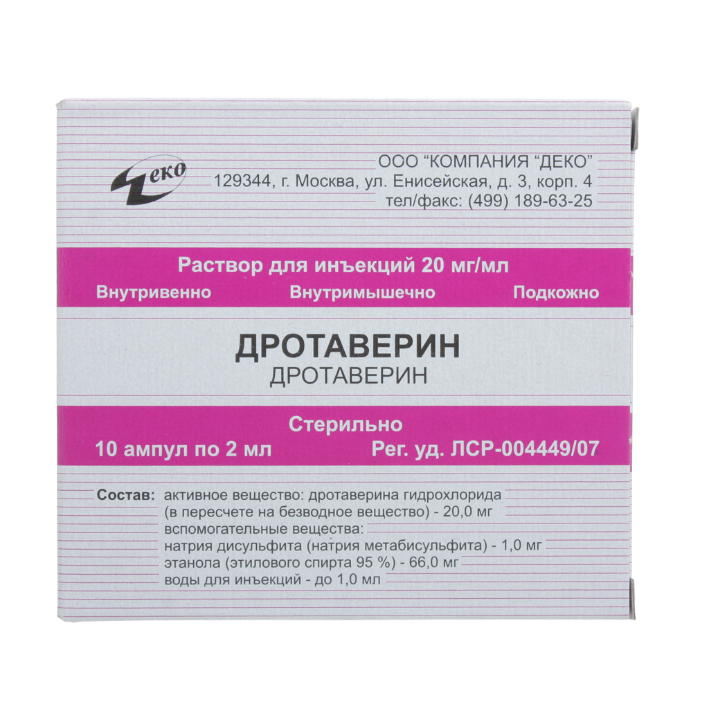 Одна ампула (2 мл раствора) содержит в качестве активного вещества 40 мг (в пересчете на безводное вещество) дротаверина гидрохлорида.