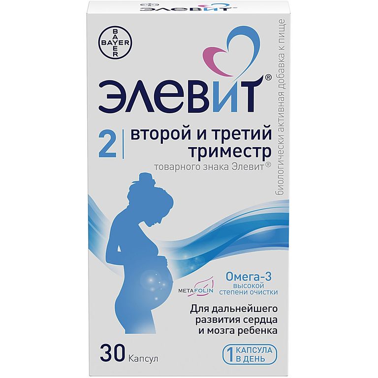 Элевит® 2 - Второй и Третий Триместр т.з. Элевит® БАД к пище. Рекомендован со 2-го триместра беременности и до рождения ребенка. Содержит 12 витаминов и 6 микроэлементов, а также омега-3 высокой степени очистки в 1 капсуле. Способствует дальнейшему развитию сердца и мозга ребенка.