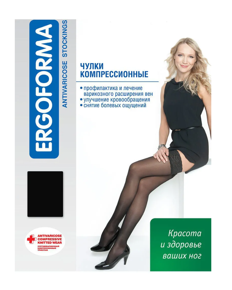 Чулки Ergoforma 221 второго класса компрессии (23-32 мм рт.ст.). выполнены из специального материала, который создает строго градуированную степень компрессии: 100 % в самой узкой части щиколотки, 70% в области голени и 40% в области бедра.