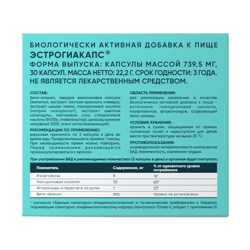 Бета-аланин; твердая желатиновая капсула (желатин); экстракт листьев красного клевера; экстракт шишек хмеля; гиалуроновая кислота (натрия гиалуронат); экстракт цветков календулы; магниевая соль стеариновой кислоты (Е470b, стабилизатор), диоксид кремния аморфный (Е551, агент антислеживающий).