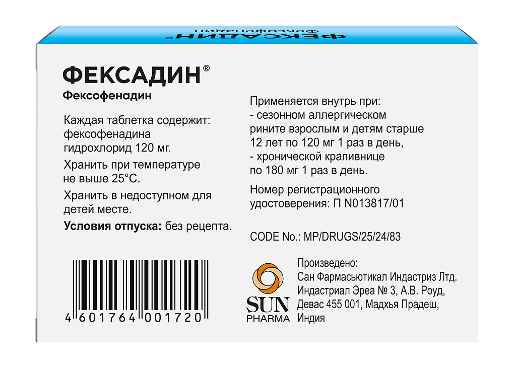 Активный ингредиент: фексофенадина гидрохлорид 120 мг или 180 мг.