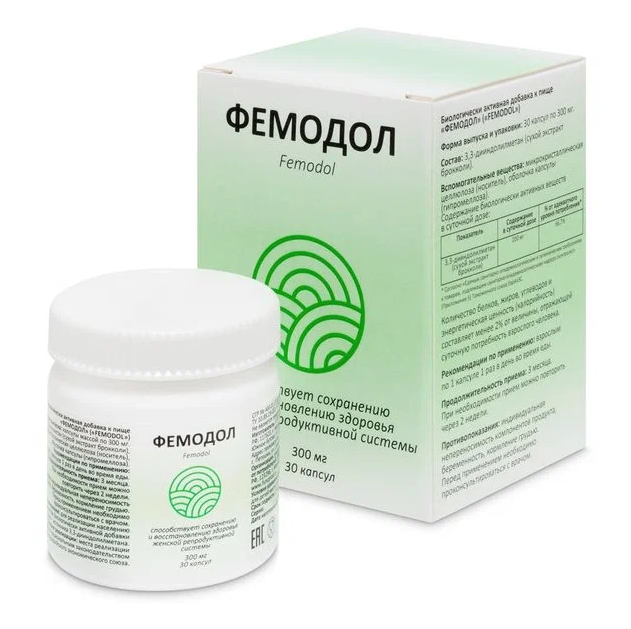 ФЕМОДОЛ - Биологически активная добавка (БАД) к пище - в составе которого содержится 3,3-дииндолилметан (сухой экстракт брокколи) - стабильная форма индола, который метаболизируется в желудке в течение первых минут контакта с желудочным соком.