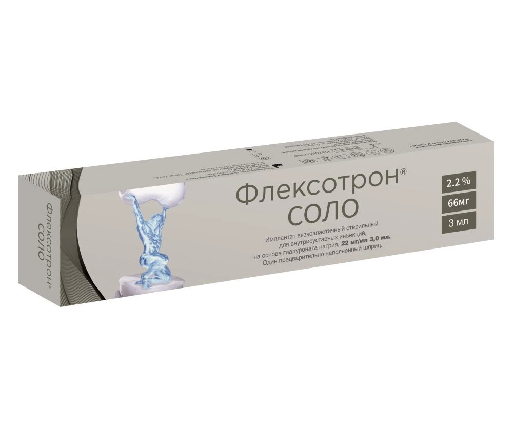 ФЛЕКСОТРОН® Соло – протез синовиальной жидкости, стерильный, прозрачный вязкоэластичный гель, содержащий гиалуронат натрия, получаемый методом бактериальной ферментации, в фосфатном буфере. Имплантат не содержит лекарственного средства для медицинского применения, материалов животного и (или) человеческого происхождения.