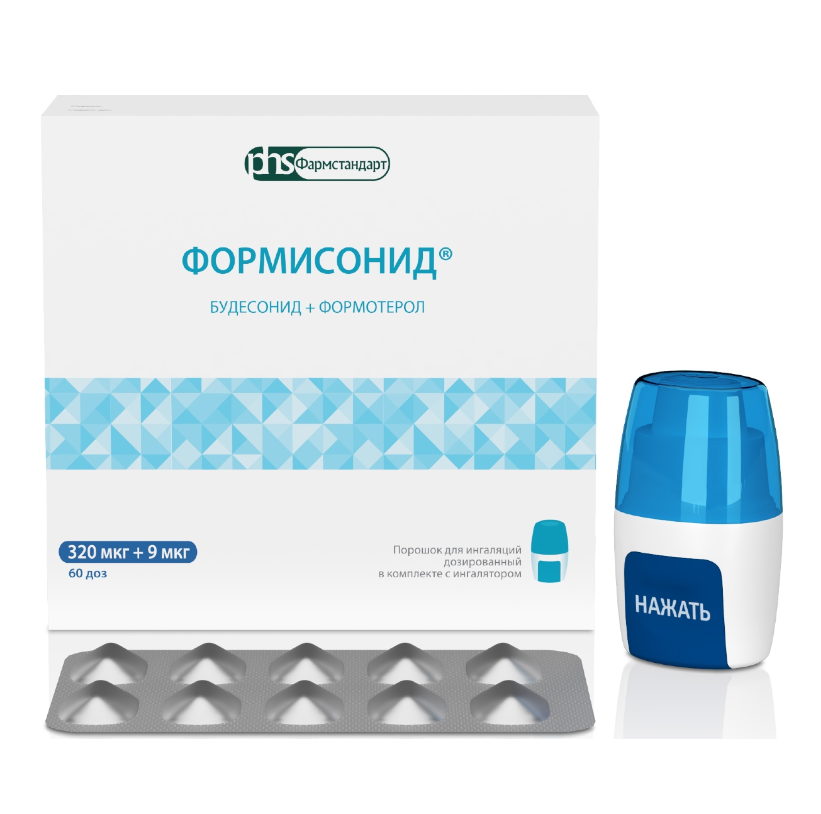 Формисонид® содержит будесонид и формотерол, которые имеют разные механизмы действия и проявляют аддитивный эффект в отношении снижения частоты обострений бронхиальной астмы. Особые свойства будесонида и формотерола дают возможность использовать их комбинацию для купирования приступов/симптомов с противовоспалительным действием, или как поддерживающую терапию бронхиальной астмы.