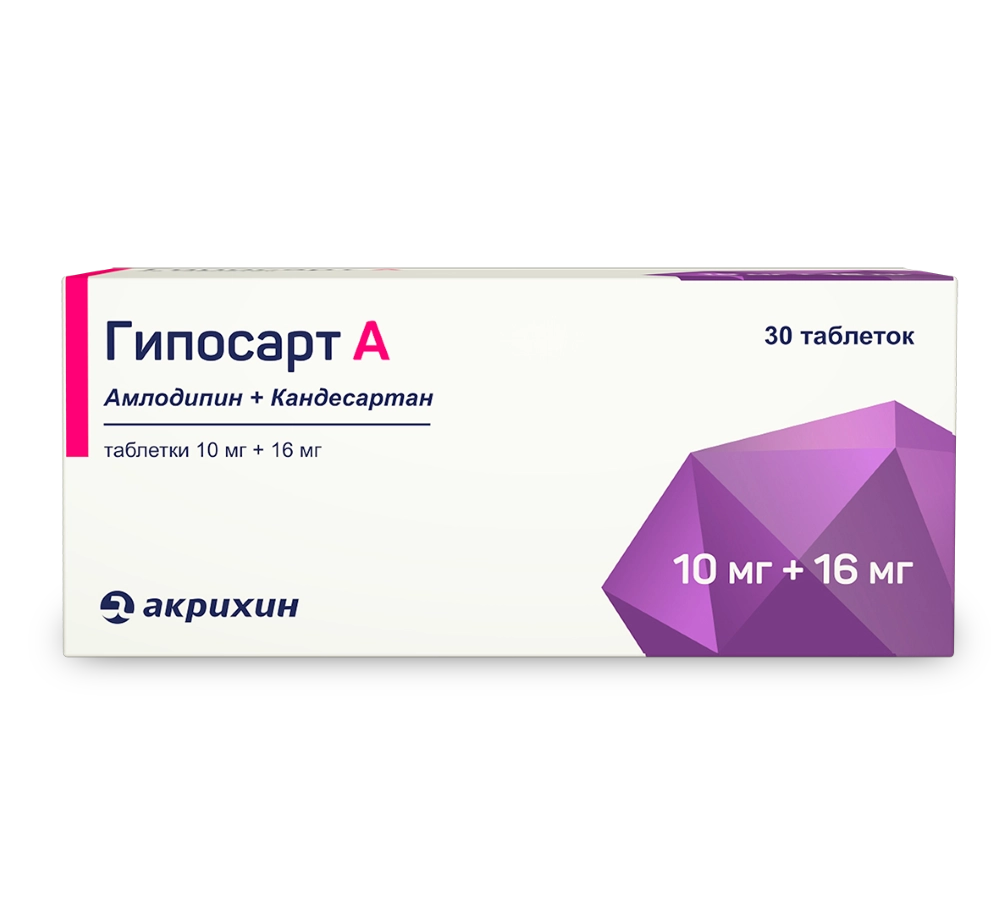 Препарат Гипосарт А — гипотензивное (снижающее уровень артериального давления) комбинированное средство (антагонист рецепторов ангиотензина II + блокатор «медленных» кальциевых каналов).