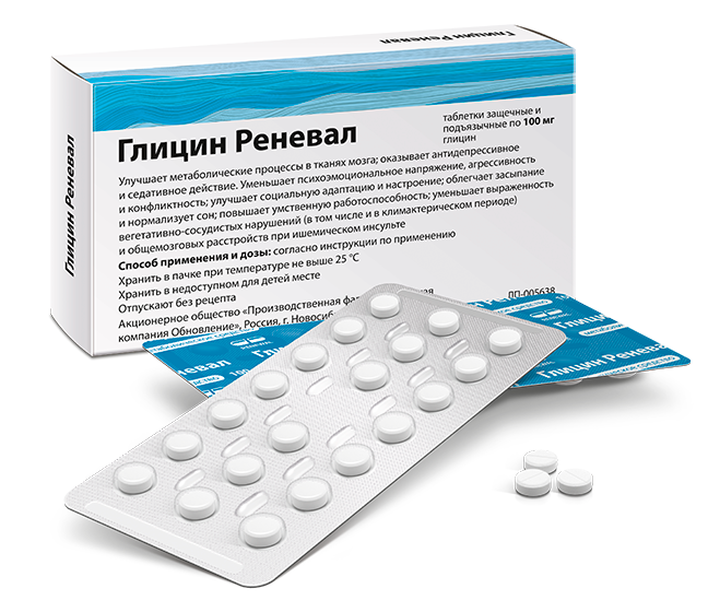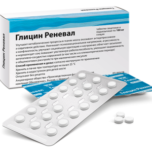 Глицин ;— заменимая аминокислота, центральный нейромедиатор тормозного типа действия: улучшает метаболические процессы в тканях мозга; оказывает антидепрессивное и седативное действие; обладает глицинергическим и ГАМК-ергическим, альфа1-адреноблокирующим, антиоксидантным и антитоксическим действием; регулирует деятельность глутаматных (NMDA) рецепторов, за счёт чего уменьшает психоэмоциональное напряжение, агрессивность и конфликтность; улучшает социальную адаптацию и настроение; облегчает засыпание и нормализует сон; повышает умственную работоспособность; уменьшает выраженность вегетативно-сосудистых нарушений (в том числе и в климактерическом периоде) и общемозговых расстройств при ишемическом инсульте и черепно-мозговой травме; снижает токсическое действие этанола на центральную нервную систему.