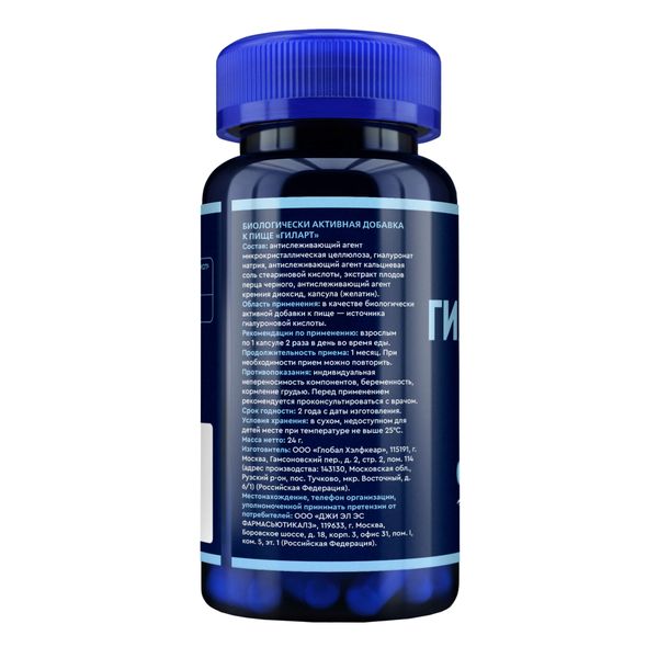 Антислеживающий агент микрокристаллическая целлюлоза, капсула (желатин), гиалуронат натрия, антислеживающий агент кальциевая соль стеариновой кислоты, экстракт плодов перца черного, антислеживающий агент кремния диоксид.