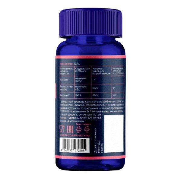 Гидролизат рыбного коллагена, L-аскорбиновая кислота, тальк (Е553iii), гиалуроновая кислота, кремния диоксид (Е551), капсула (гидроксипропилметилцеллюлоза Е464).