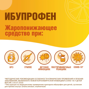 Только для кратковременного применения. Внимательно прочтите инструкцию перед приёмом препарата. Перед употреблением тщательно взболтайте флакон. 5 ;мл препарата содержат 100 ;мг ибупрофена или в ;20 ;мг ибупрофена в ;1 ;мл.