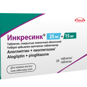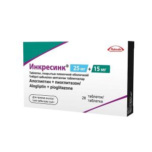 Препарат Инкресинк® представляет собой комбинацию двух гипогликемических средств с взаимодополняющими и разными механизмами действия, предназначенную для улучшения контроля гликемии у пациентов с СД2: алоглиптина, ингибитора фермента дипептидилпептидазы-4 (ДПП-4) и пиоглитазона, представителя класса тиазолидиндионов. Результаты исследований на животных при лечении диабета указывали на то, что комбинированное применение алоглиптина и пиоглитазона продуцировало аддитивное и синергическое улучшение гликемического контроля, увеличение содержания панкреатического инсулина и нормализованное распределение бета-клеток поджелудочной железы.