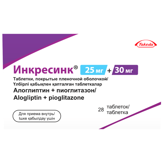 Препарат Инкресинк® представляет собой комбинацию двух гипогликемических средств с взаимодополняющими и разными механизмами действия, предназначенную для улучшения контроля гликемии у пациентов с СД2: алоглиптина, ингибитора фермента дипептидилпептидазы-4 (ДПП-4) и пиоглитазона, представителя класса тиазолидиндионов. Результаты исследований на животных при лечении диабета указывали на то, что комбинированное применение алоглиптина и пиоглитазона продуцировало аддитивное и синергическое улучшение гликемического контроля, увеличение содержания панкреатического инсулина и нормализованное распределение бета-клеток поджелудочной железы.