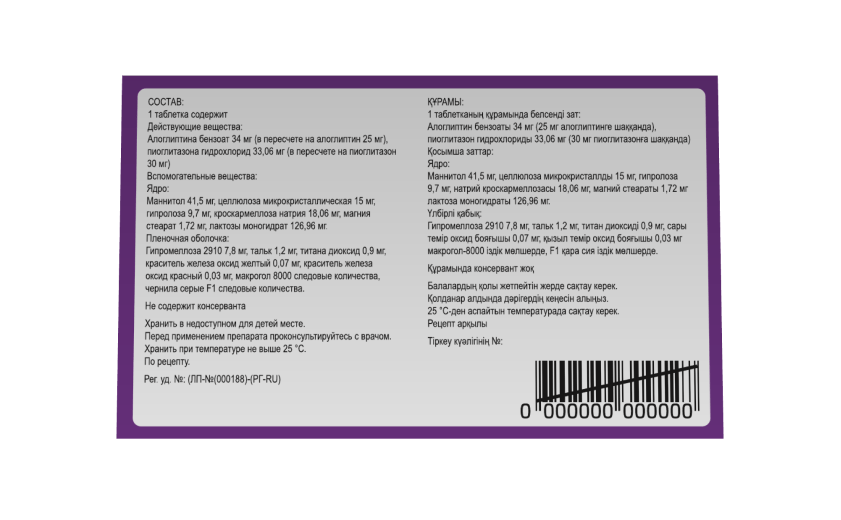 Каждая таблетка, покрытая оболочкой, содержит алоглиптина бензоат и пиоглитазона гидрохлорид в количествах, эквивалентных 25 мг алоглиптина и 15 мг пиоглитазона.