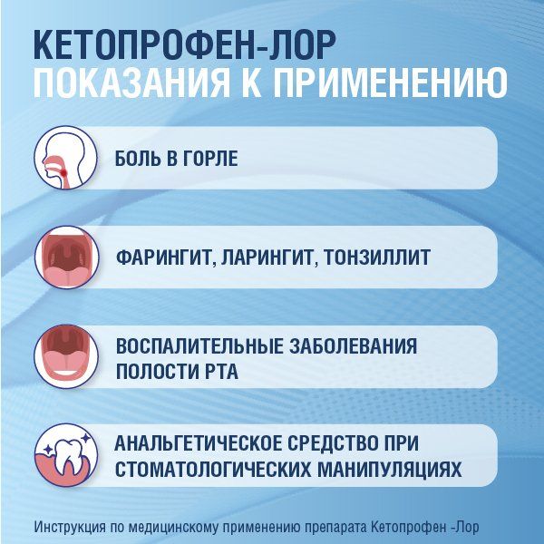 Симптоматическое лечение воспалительных заболеваний верхних дыхательных путей — тонзиллита (ангины), ларингита, фарингита воспалительных заболеваний полости рта — стоматита, гингивита, глоссита, афты, пародонтопатии, хронического пародонтоза в качестве анальгетического средства при стоматологических манипуляциях.