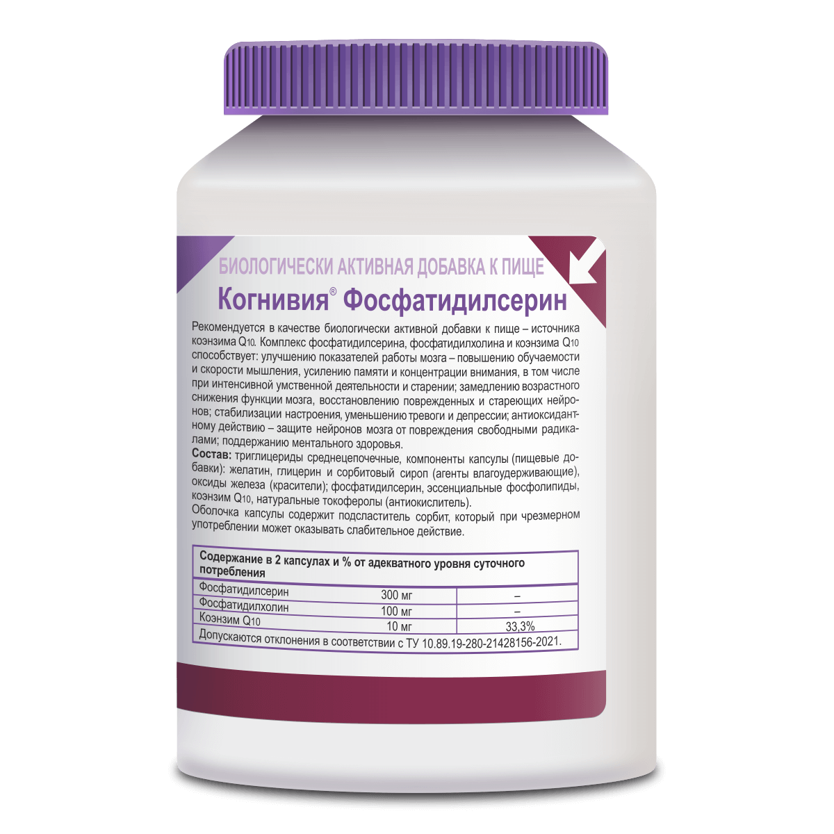 - Удобный прием. Упаковки хватит на 1 месяц, даже если вы принимаете максимальную дневную дозировку фосфатидилсерина (300 мг).
