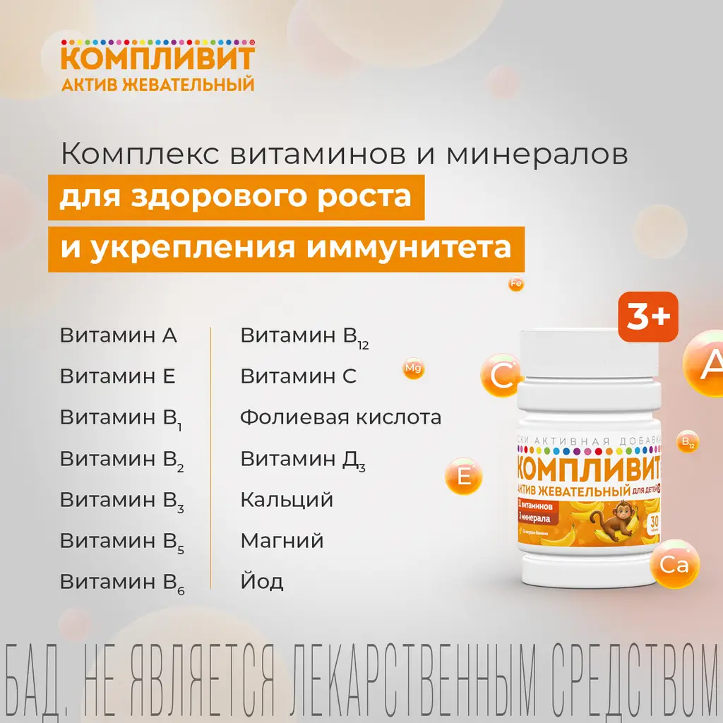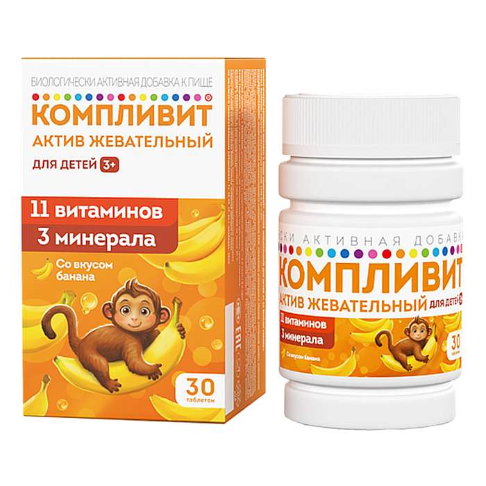 Компливит Актив жевательный для детей 3+ таблетки жевательные массой 1300г со вкусом банана №30