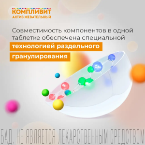 Действие биологически активной добавки "Компливит Актив жевательный" обусловлено свойствами входящих в состав компонентов. Комплекс витаминов и минералов, являющихся важными факторами полноценного физического и интеллектуального развития ребенка, укрепления иммунитета, усиления адаптационных возможностей организма. Сбалансирован с учетом рекомендуемых уровней потребления микронутриентов.