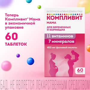 Комплекс содержит 11 витаминов, 7 минералов, данный комплекс создан с учетом потребностей женщин в витаминах и минералах во время беременности, в период кормления грудью. Совместимость компонентов, входящих в состав БАД «Компливит® «Мама» для беременных и кормящих», обеспечена специальной технологией.