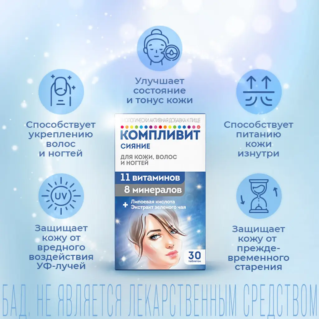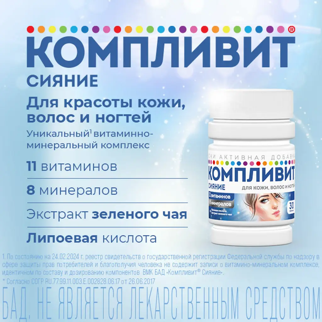 КОМПЛИВИТ® СИЯНИЕ рекомендуется в качестве биологически активной добавки к пище - дополнительного источника витаминов А, С, Е, группы В (В1, В2, В6, В12, фолиевой кислоты, биотина, кальция пантотената, никотинамида), минеральных элементов (меди, селена, кремния, железа, кобальта), липоевой кислоты и катехинов, содержащей кальций и цинк. Оказывает общеукрепляющее действие, способствует улучшению состояния кожи, волос и ногтей.