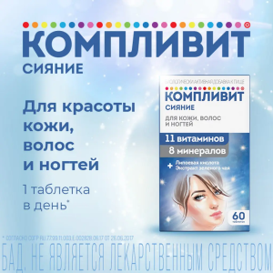 КОМПЛИВИТ® СИЯНИЕ рекомендуется в качестве биологически активной добавки к пище - дополнительного источника витаминов А, С, Е, группы В (В1, В2, В6, В12, фолиевой кислоты, биотина, кальция пантотената, никотинамида), минеральных элементов (меди, селена, кремния, железа, кобальта), липоевой кислоты и катехинов, содержащей кальций и цинк. Оказывает общеукрепляющее действие, способствует улучшению состояния кожи, волос и ногтей.