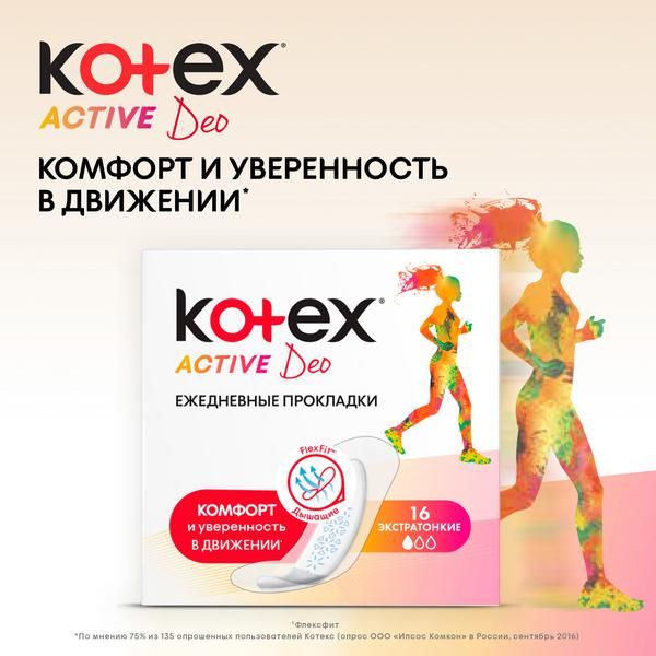 Новые экстратонкие ежедневные прокладки Kotex Active Deo (Котекс Эктив Део) созданы специально для активных девушек. Благодаря уникальной технологии FlexFit прокладка гибкая, поэтому может повторять движения тела даже во время активных занятий. Дышащие задняя и передняя поверхности: более 100 000 дышащих микропор созданы, чтобы обеспечить комфорт коже. Уникальная форма: Экстратонкая прокладка, менее 1 мм в толщину Яркая индивидуальная упаковка - удобно взять с собой в сумочку