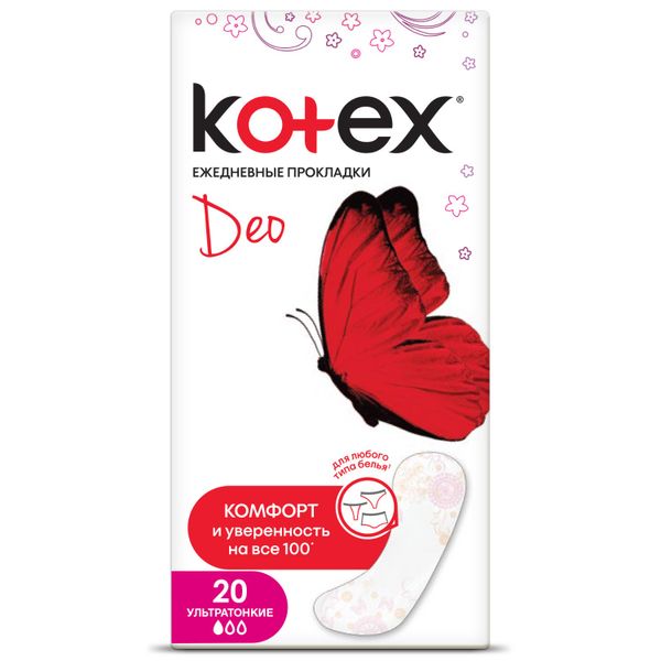 Ультратонкие ежедневные прокладки Kotex® Deo Ультратонкие помогают чувствовать себя увереннее, что особенно важно в условиях современного ритма жизни всех девушек. Благодаря гибким краешкам, они подходят для разного типа белья. Прокладки ультратонкие, дышащие, ароматизированные, защищают от запаха*. Оригинальное тиснение по краям прокладки препятствует ее расслоению, а женственные узоры добавят удовольствия при использовании!
