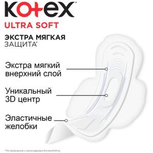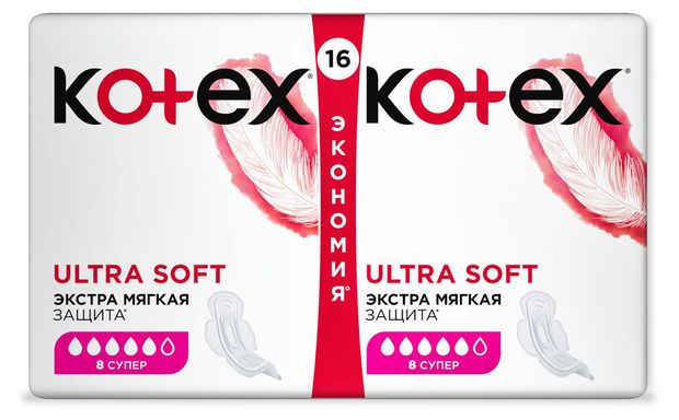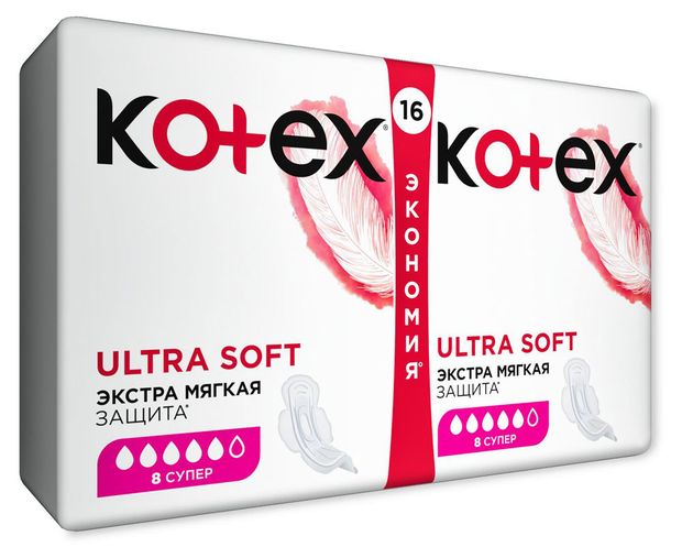 Тонкие гигиенические прокладки Kotex® Ultra Soft СУПЕР созданы для стопроцентной, улучшенной защиты во время обильных менструаций. Это прокладки с эластичными желобками, придающими изделиям гибкость и способность повторять контуры тела, и удерживающим жидкость 3D-центром.Самое важное: у них удлинённый задний край, который исключает попадание влаги на одежду, а значит — гарантирует свежесть и чистоту белья надолго. Мягкая поверхность изделий гипоаллергенна.